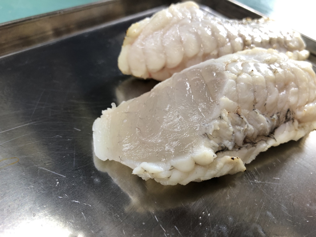 したひら鮮魚店では新鮮なうちは『能登ふぐのたたき』で提供しております。お刺身だとコリコリとした歯ごたえが楽しめます。みそ汁など加熱すると出汁がたっぷり出て、身もぎゅっと締まり非常に美味しいんです。白子は天ぷらが定番ですが、塩ゆでをして、熱々の時に食べると何もつけなくてもとっても美味しいです。